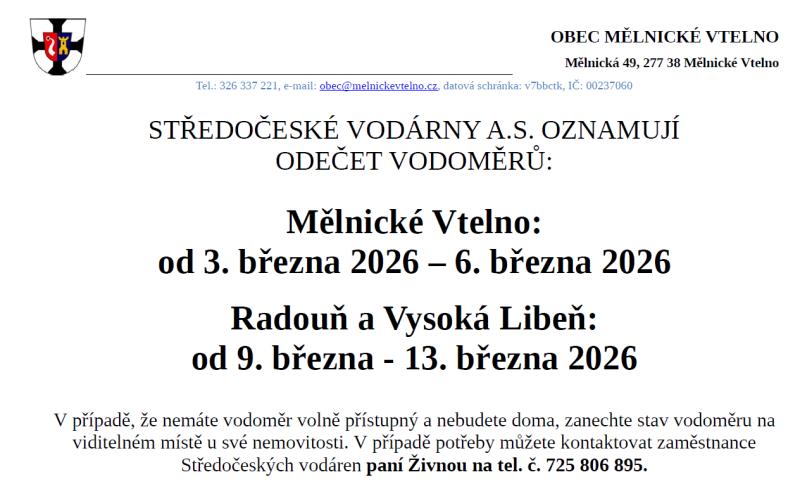 STŘEDOČESKÉ VODÁRNY A.S. OZNAMUJÍ ODEČET VODOMĚRŮ
