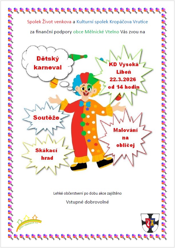 Spolek Život venkova a Kulturní spolek Kropáčova Vrutice za finanční podpory obce Mělnické Vtelno Vás zvou na Dětský karneval, který se koná dne 22.3.2026 od 14 hod. v KD Vysoká Libeň.