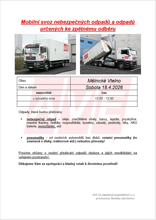Mobilní svoz nebezpečných odpadů a odpadů určených ke zpětnému odběru.