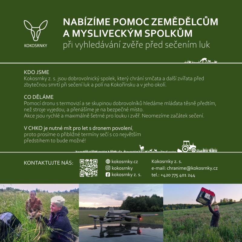 Nabídka pomoci zemědělcům a mysliveckým spolkům při vyhledávání zvěře před sečením luk