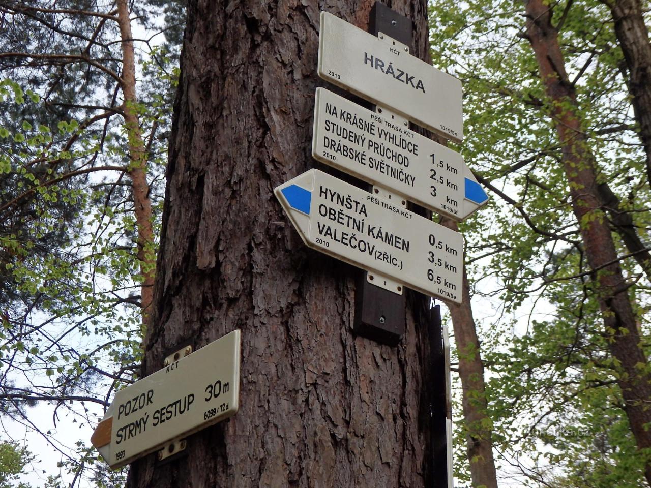 Turistické rozcestí nabízí Drábské světničky, Studený průchod a Na krásné vyhlídce po modré jedním směrem. Opačným směrem po modré dojdeme na Hynštu, k Obětnímu kameni nebo na zříceninu hradu Valečov…