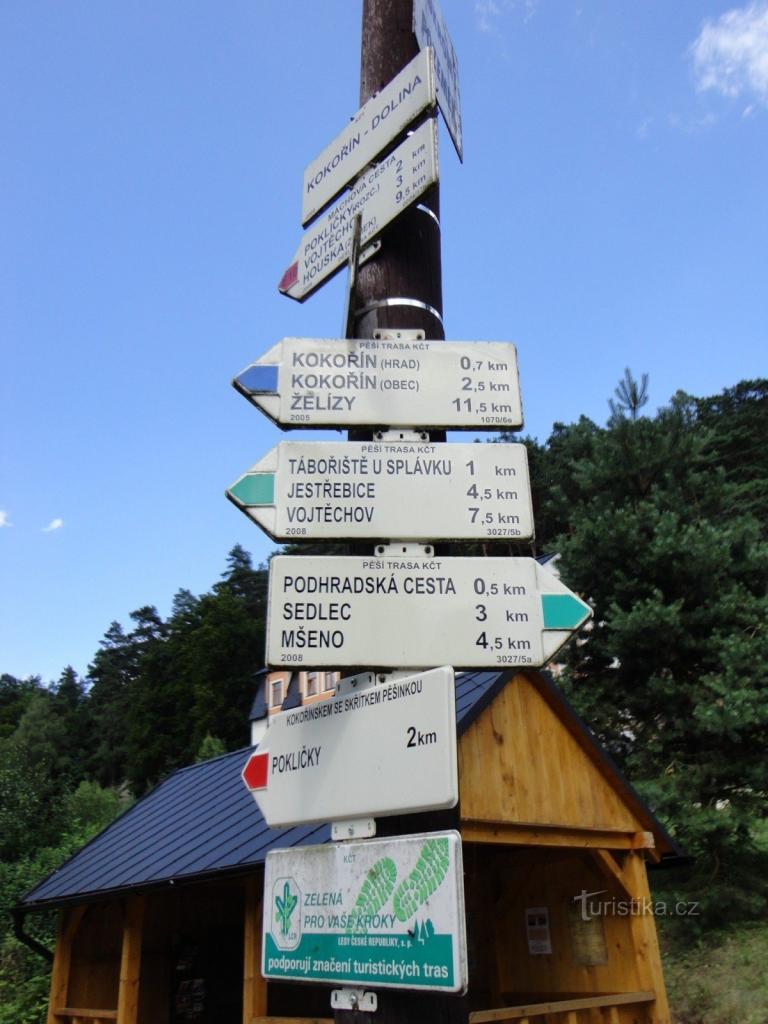 Turistický rozcestník, který se nachází u parkoviště pod Hotelem Kokořín, ukazuje turistům cestu do tří směrů. Po modré značce ve směru Kokořín dolina - Kokořín hrad, Kokořín obec, Dolní Zimoř,…