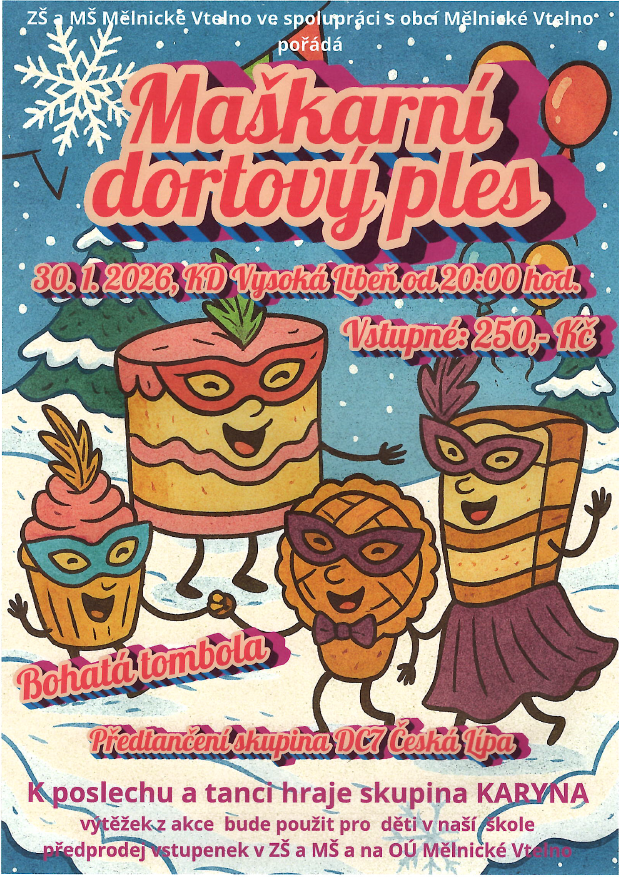 ZŠ a MŠ Mělnické Vtelno ve spolupráci s obcí Mělnické Vtelno pořádá Maškarní dortový ples 30.01.2026